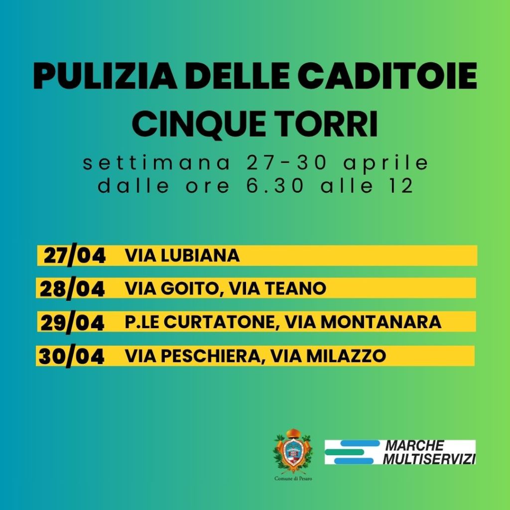 Continua la pulizia delle caditoie su suolo pubblico della città. Nella settimana da lunedì 27 a giovedì 30 aprile, Marche Multiservizi in accordo con il Comune di Pesaro, interverrà al mattino dalle ore 6.30 alle 12 in diverse vie del Q2 “Cinque Torri-Santa Veneranda”.